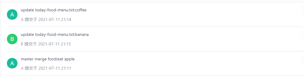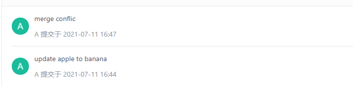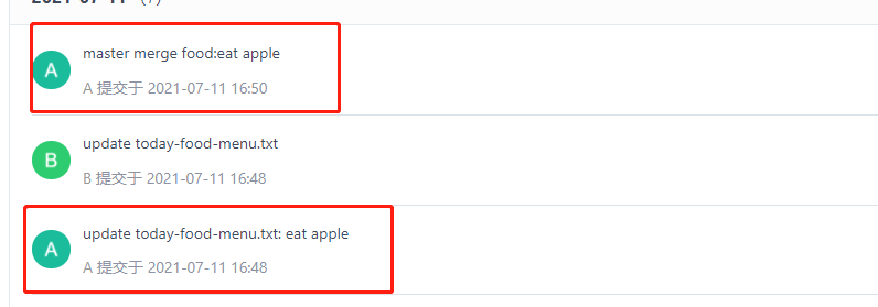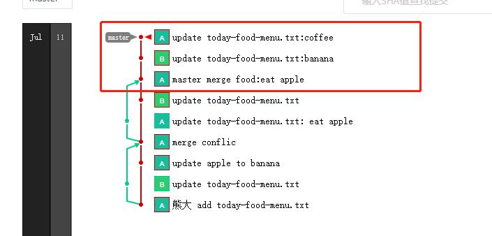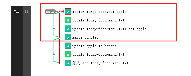从图中可以看到,master merge food: eat apple这次 commit 将前面的两次提交进行了合并,因为前面的这两次 commit 的代码完全相同的点在merge confilc这次提交,所以从merge confic到master merge food:eat apple这里多出来一个分叉的历史记录(绿线)。
