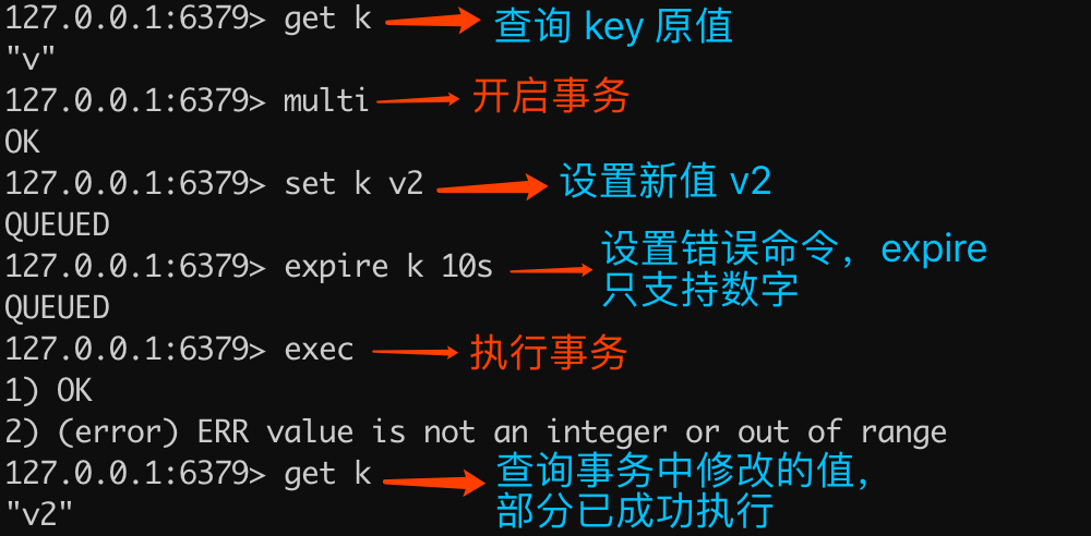 可以看出,重复执行 multi 会导致入列错误,但不会终止事务,最终查询的结果是事务执行成功了。除了重复执行 multi 命令,还有在事务状态下执行 watch 也是同样的效果,下文会详细讲解关于 watch 的内容。
