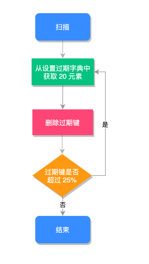 Redis 过期键值删除使用的是贪心策略,它每秒会进行 10 次过期扫描,此配置可在 redis.conf 进行配置,默认值是 hz 10,Redis 会随机抽取 20 个值,删除这 20 个键中过期的键,如果过期 key 的比例超过 25%,重复执行此流程,如下图所示: