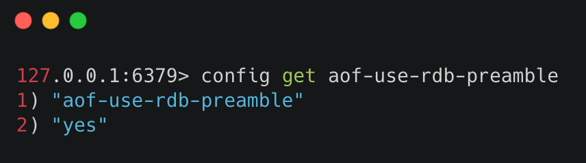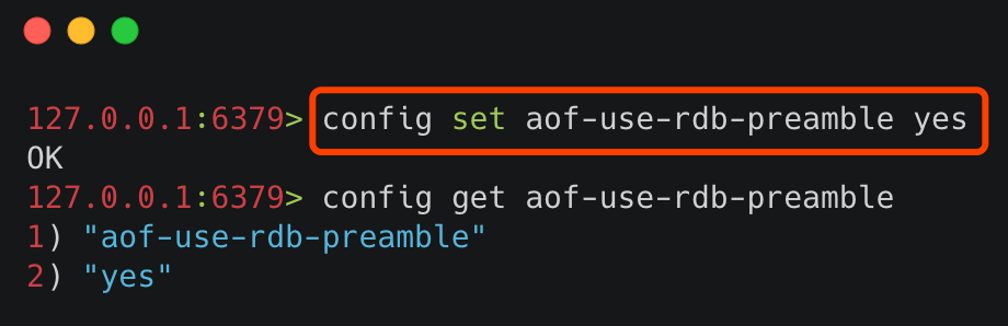 通过命令行开启 使用命令 config set aof-use-rdb-preamble yes 执行结果如下图所示¶