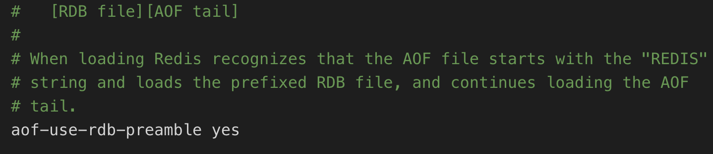 在 Redis 的根路径下找到 redis.conf 文件,把配置文件中的 aof-use-rdb-preamble no 改为 aof-use-rdb-preamble yes 如下图所示: