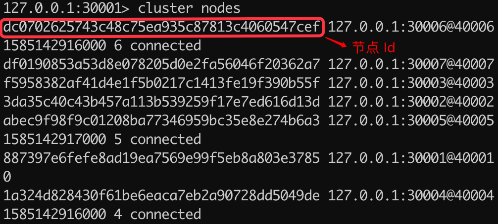 此命令和 meet 命令不同的时,删除节点需要把使用节点的 Id 进行删除,可以通过 cluster nodes 命令查看所有节点的 Id 信息,其中每一行的最前面的 40 位字母和数组的组合就是该节点的 Id,如下图所示: