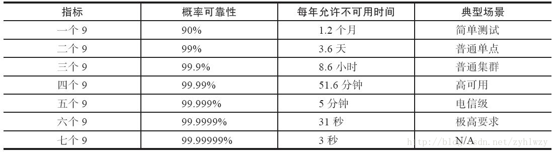 其中,MTBF(Mean Time Between Failure)是指相邻两次故障之间的平均工作时间,MTTR(Mean Time To Repair)是指系统由故障状态转为工作状态所需修复时间的平均值。通常,用 N 个 9 来表征系统可用性,比如 99.9%(3-nines Availability),99.999%(5-nines Availability)。