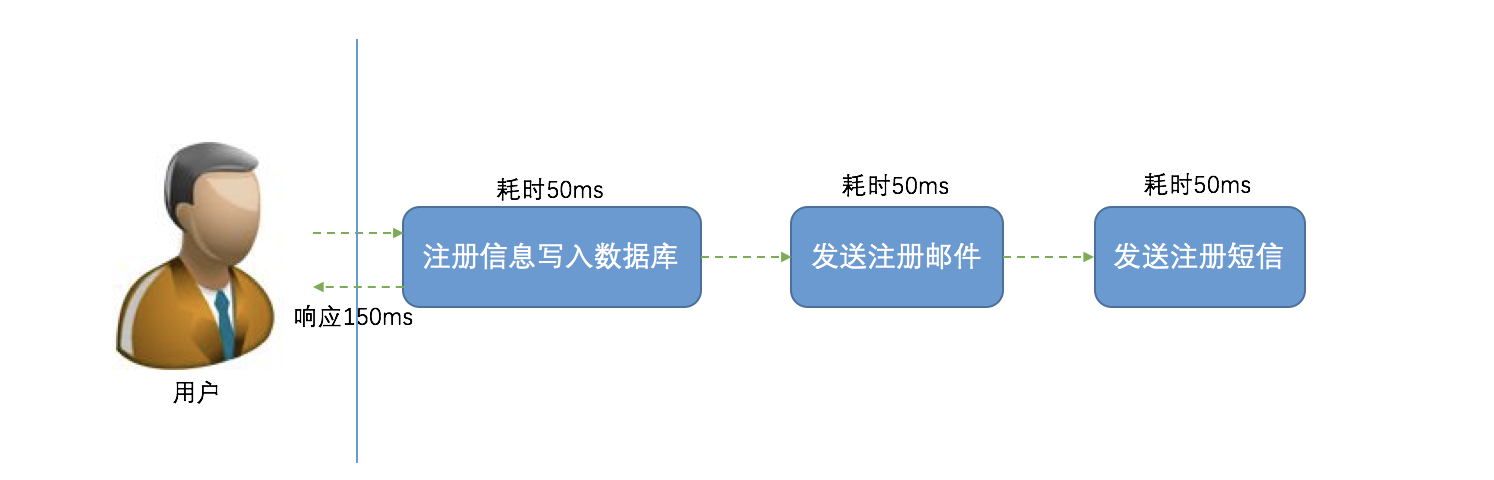 1.串行方式:将注册信息写入数据库成功后,发送注册邮件,再发送注册短信。以上三个任务全部完成后,返回给客户端,如下图示:
