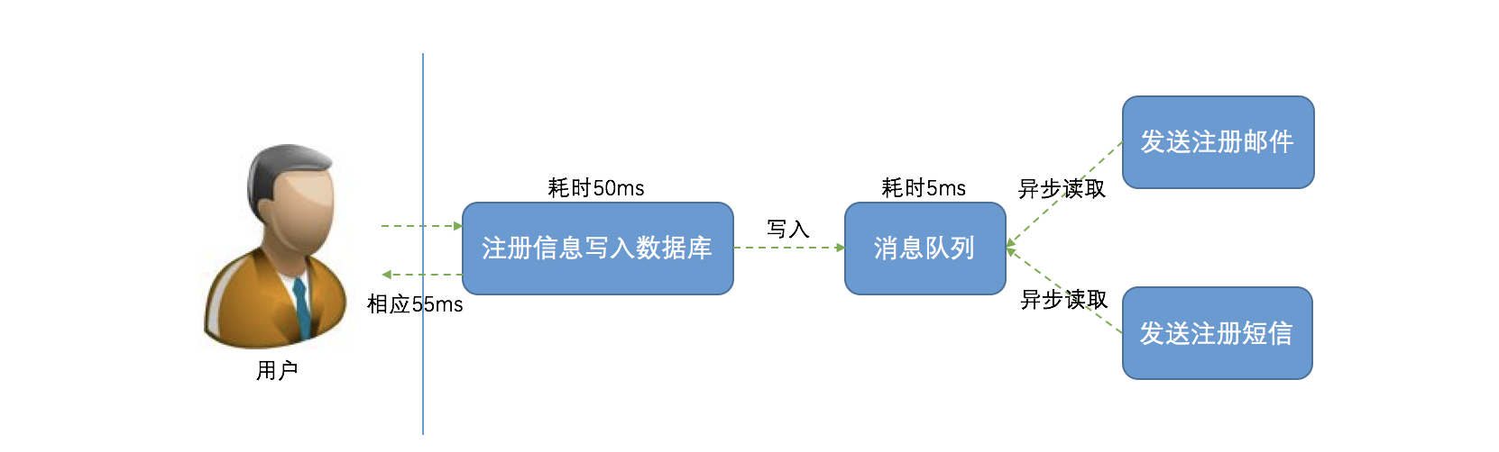 将注册信息写入数据库成功后,将消息写入消息队列,然后立即返回成功;此后,邮件系统和短信系统分别从消息队列中获取注册信息,再发送注册邮件和短信。很明显,借助消息队列的异步处理能力,将极大的提高响应速度。