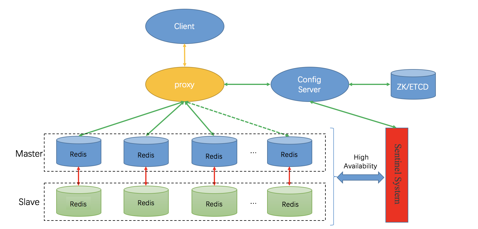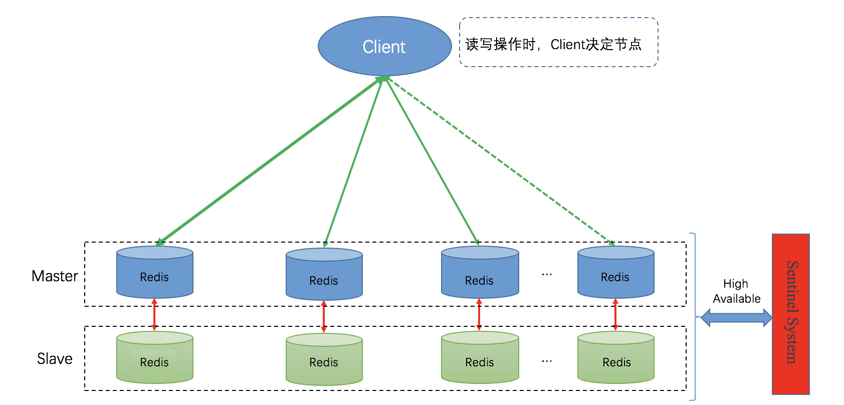 如下图所示,客户端与 Redis 节点直连,为了提高可用性,每个主节点挂一个从节点,故障倒换可由“哨兵”系统实现(其它方案也可实现)。客户端对任何一个主节点的读写操作本质上就是单机模式下的读写操作;对于一个 Key-Value,其读写节点完全由客户端决定。比如,采用 Hash 算法