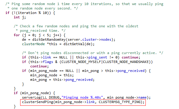 而 clusterCron() 中又会调用 clusterSendPing() 函数,该函数用于将随机选择的节点的信息加入到 Ping 消息体中,然后发送出去。部分源码如下: