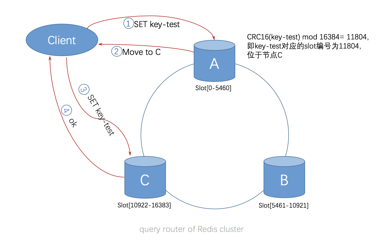 和普通的查询路由相比,Redis Cluster 借助客户端实现的请求路由是一种混合形式的查询路由,它并非从一个 Redis 节点到另外一个 Redis,而是借助客户端转发到正确的节点。