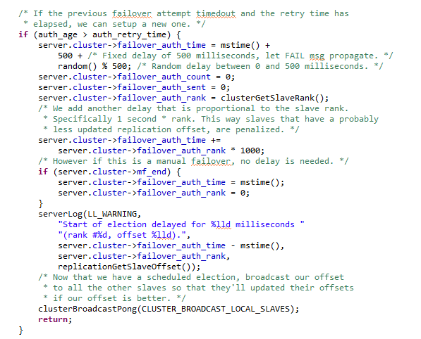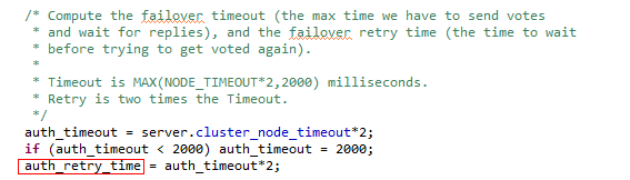 既然是拉票,就有可能因未能获得半数投票而失败,一轮选举失败后,需要等待一段时间(auth_retry_time)才能清理标志位,准备下一轮拉票。从节点拉票之前也需要等待,等待时间计算方法如下: