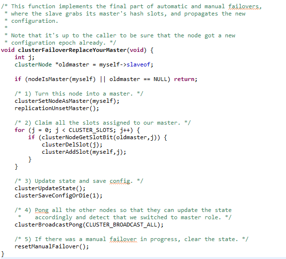 上述过程由 cluster.c 中的函数 void clusterFailoverReplaceYourMaster(void) 完成,源码如下所示: