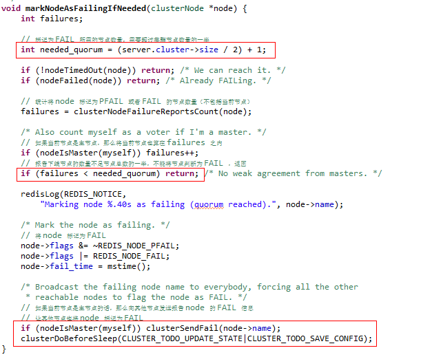 下线判决相关的源码位于 cluster.c 的函数 void markNodeAsFailingIfNeeded(clusterNode *node) 中,如下所示: