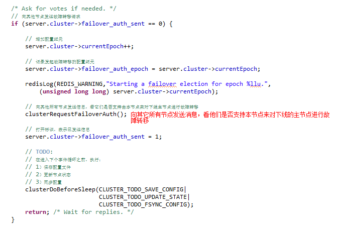 基于故障检测信息的传播,集群中所有正常节点都将感知到某个主节点下线(Fail)的信息,当然也包括这个下线主节点的所有从节点。当从节点发现自己复制的主节点的状态为已下线时,从节点就会向集群广播一条请求消息,请求所有收到这条消息并且具有投票权的主节点给自己投票。