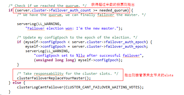 所有发起投票的从节点中,只有获得超过半数主节点投票的从节点有资格升级为主节点,并接管故障主节点所负责的 Slots,源码如下: