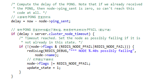 在第 03 课中介绍过,集群中的每个节点都会定期通过集群内部通信总线向集群中的其它节点发送 PING 消息,用于检测对方是否在线。如果接收 PING 消息的节点没有在规定的时间内(cluster_node_timeout)向发送 PING 消息的节点返回 PONG 消息,那么,发送 PING 消息的节点就会将接收 PING 消息的节点标注为疑似下线状态(Probable Fail,PFAIL)。如下源码: