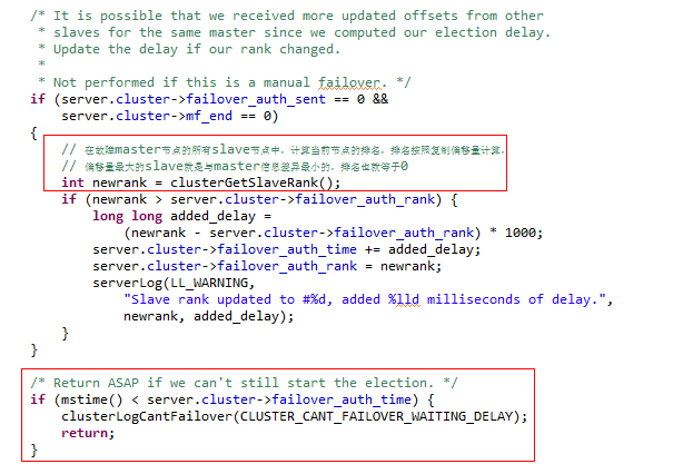 如下代码所示,在故障主节点的所有从节点中,计算当前节点(当然也是故障主节点的从节点)的排名,排名按照复制偏移量计算,偏移量最大的从节点与主节点信息差异也最小,排名也就等于 0,其余从节点排名依次递增。通过排名计算发起选举的等待时间,根据源码,排名等于 0 的从节点无需等待即可发起拉票,其它排位的从节点则须等待,等待时间计算方法如下: