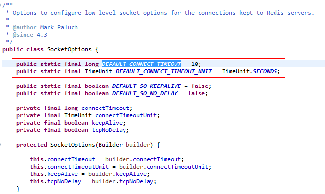 为了优化耗时,我当时阅读了开源客户端 Lettuce 的源码,原来 Lettuce 的连接超时机制采用的超时时间为 10s,部分源码如下:
