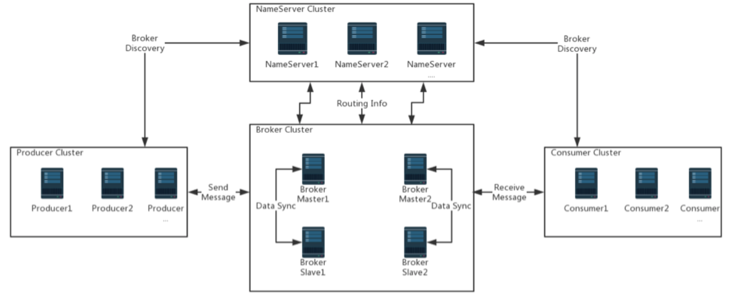 NameServer 通常也是集群的方式部署,各实例间相互不进行信息通讯。Broker 向每一台 NameServer 注册自己的路由信息,所以每一个 NameServer 实例上面都保存一份完整的路由信息。当某个 NameServer 因某种原因下线,Broker 仍然可以向其它 NameServer 同步其路由信息,Produce、Consumer 仍然可以动态感知 Broker 的路由信息。