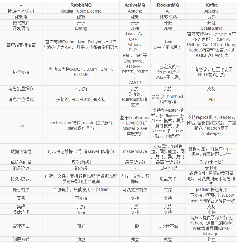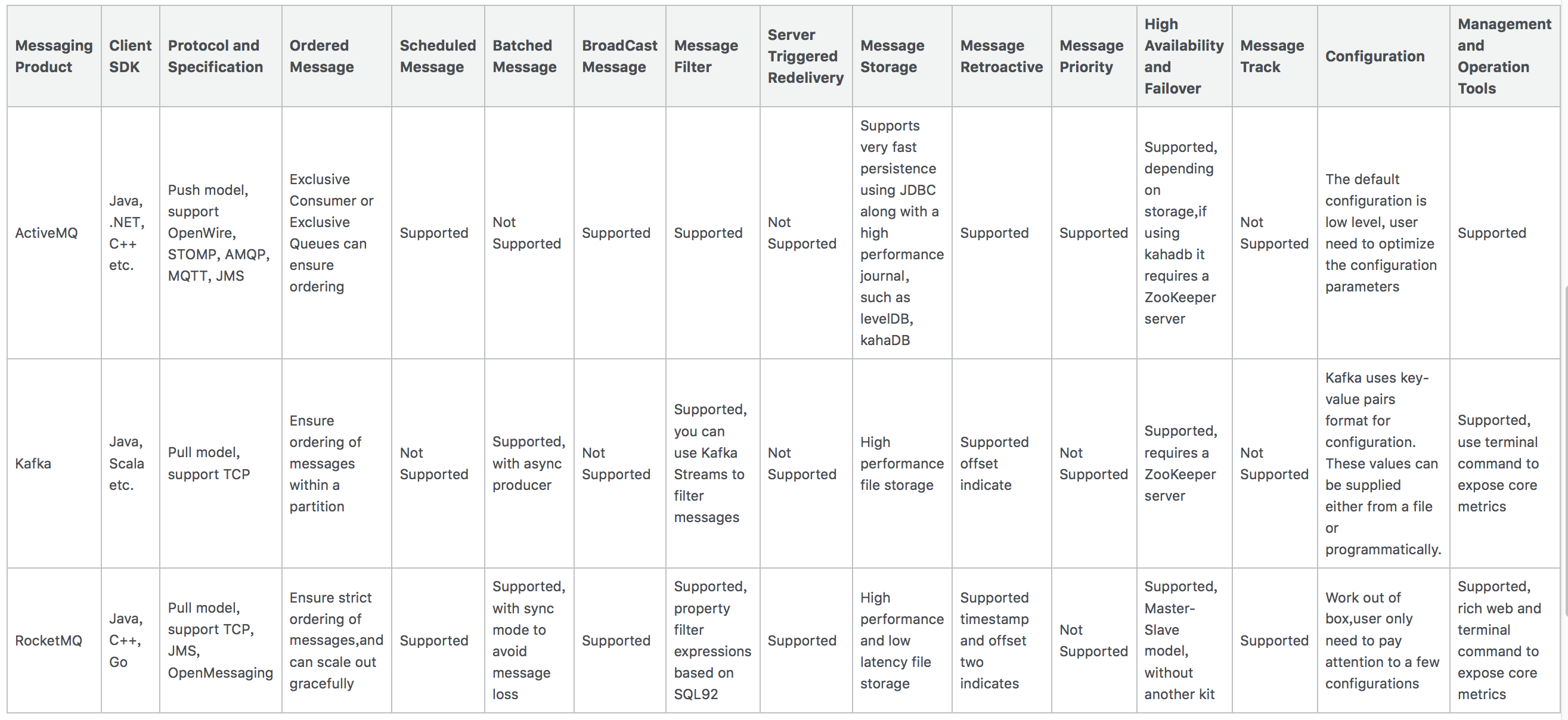 简而言之,ActiveMQ 和 Kafka 的性能都不能满足阿里的超大规模应用场景。在此背景下,阿里自研了 RocketMQ,并捐赠给了开源社区,目前有超过 100 家企业在使用其开源版本。关于 ActiveMQ 、Kafka 以及 RocketMQ 的比较如下所示(取自 RocketMQ 官网文档):