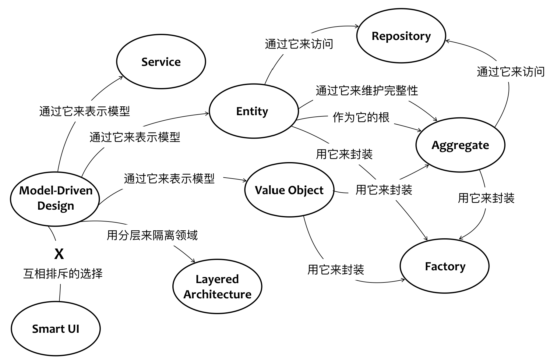 Eric Evans 通过下图勾勒出了战术设计诸要素之间的关系:
