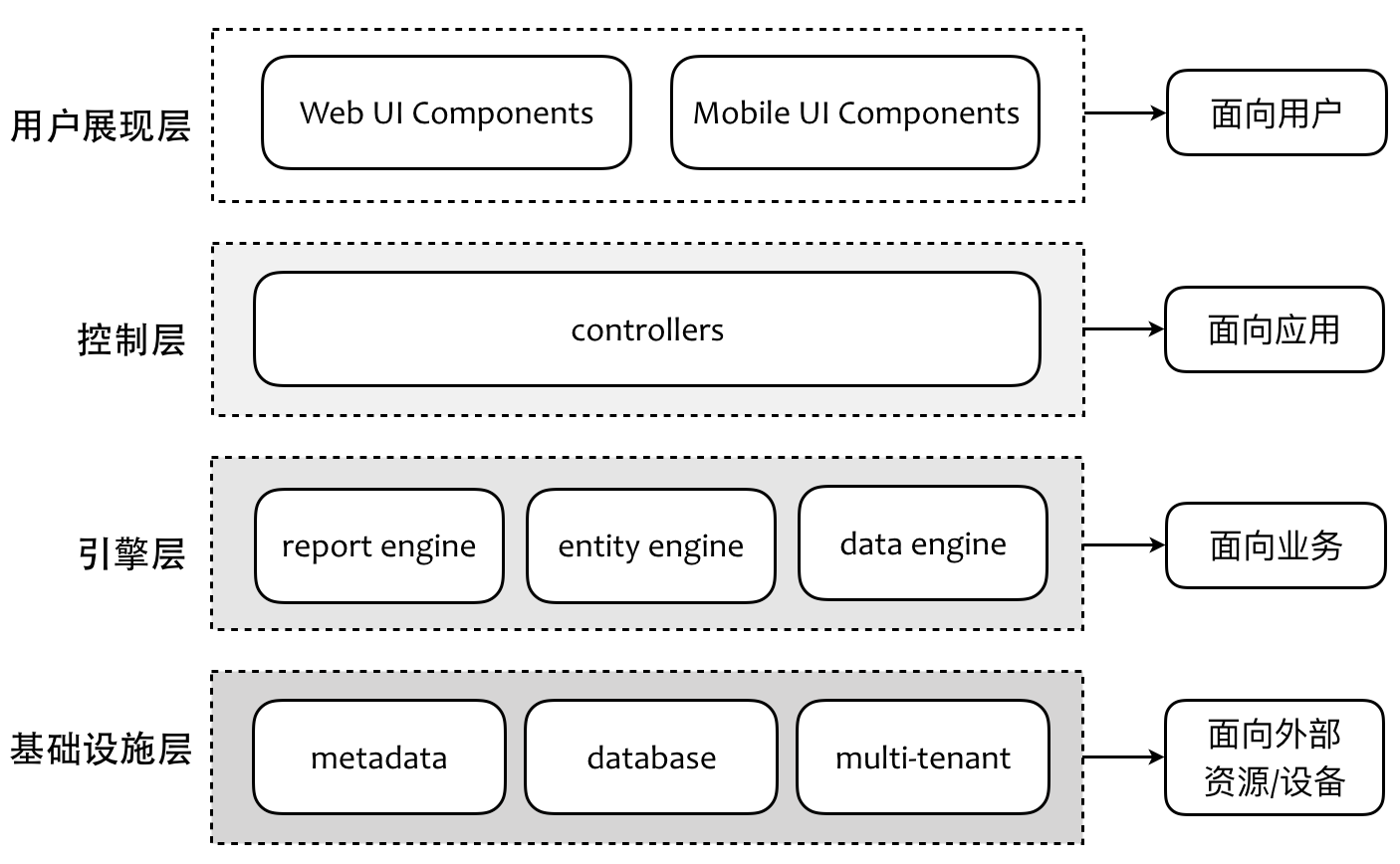 在进行分层时,我们还应该 保证同一层的组件处于同一个抽象层次。这是分层架构的设计原则,它借鉴了 Kent Beck 在 Smalltalk Best Practice Patterns 一书提出的“组合方法”模式,该模式要求一个方法中的所有操作处于相同的抽象层,这就是所谓的“单一抽象层次原则(SLAP)”,这一原则可以运用到分层架构中。例如,在一个基于元数据的多租户报表系统中,我们特别定义了一个引擎层(Engine Layer),这是一个隐喻,相当于为报表系统提供报表、实体与数据的驱动引擎。引擎层之下,是基础设施层,提供了多租户、数据库访问与元数据解析与管理等功能。在引擎层之上是一个控制层,通过该控制层的组件可以将引擎层的各个组件组合起来,分层架构的顶端是面向用户的用户展现层,如下图所示: