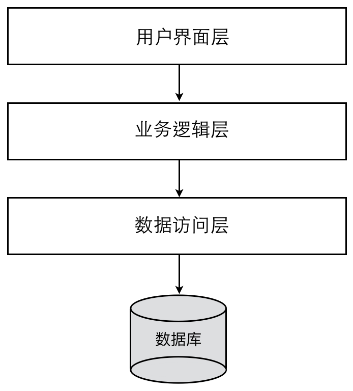 在软件架构中,经典三层架构自顶向下由用户界面层(User Interface Layer)、业务逻辑层(Business Logic Layer)与数据访问层(Data Access Layer)组成,该分层架构之所以能够流行,是有其历史原因的。在提出该分层架构的时代,多数企业系统往往较为简单,本质上都是一个单体架构(Monolithic Architecture)的数据库管理系统。这种分层架构已经是 Client-Server 架构的进化了,它有效地隔离了业务逻辑与数据访问逻辑,使得这两个不同关注点能够相对自由和独立地演化。一个经典的三层架构如下所示: