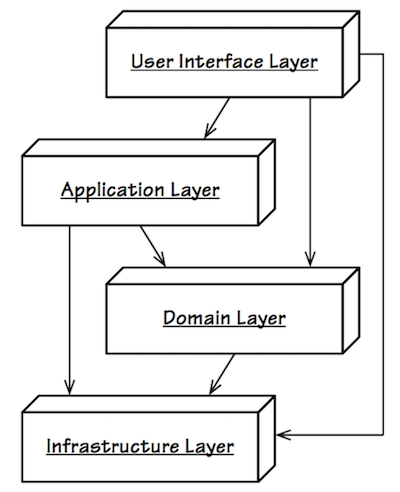 领域驱动设计在经典三层架构的基础上做了进一步改良,在用户界面层与业务逻辑层之间引入了新的一层,即应用层(Application Layer)。同时,一些层次的命名也发生了变化,将业务逻辑层更名为领域层自然是题中应有之义,而将数据访问层更名为基础设施层(Infrastructure Layer),则突破了之前数据库管理系统的限制,扩大了这个负责封装技术复杂度的基础层次的内涵。下图为 Eric Evans 在其经典著作《领域驱动设计》中的分层架构: