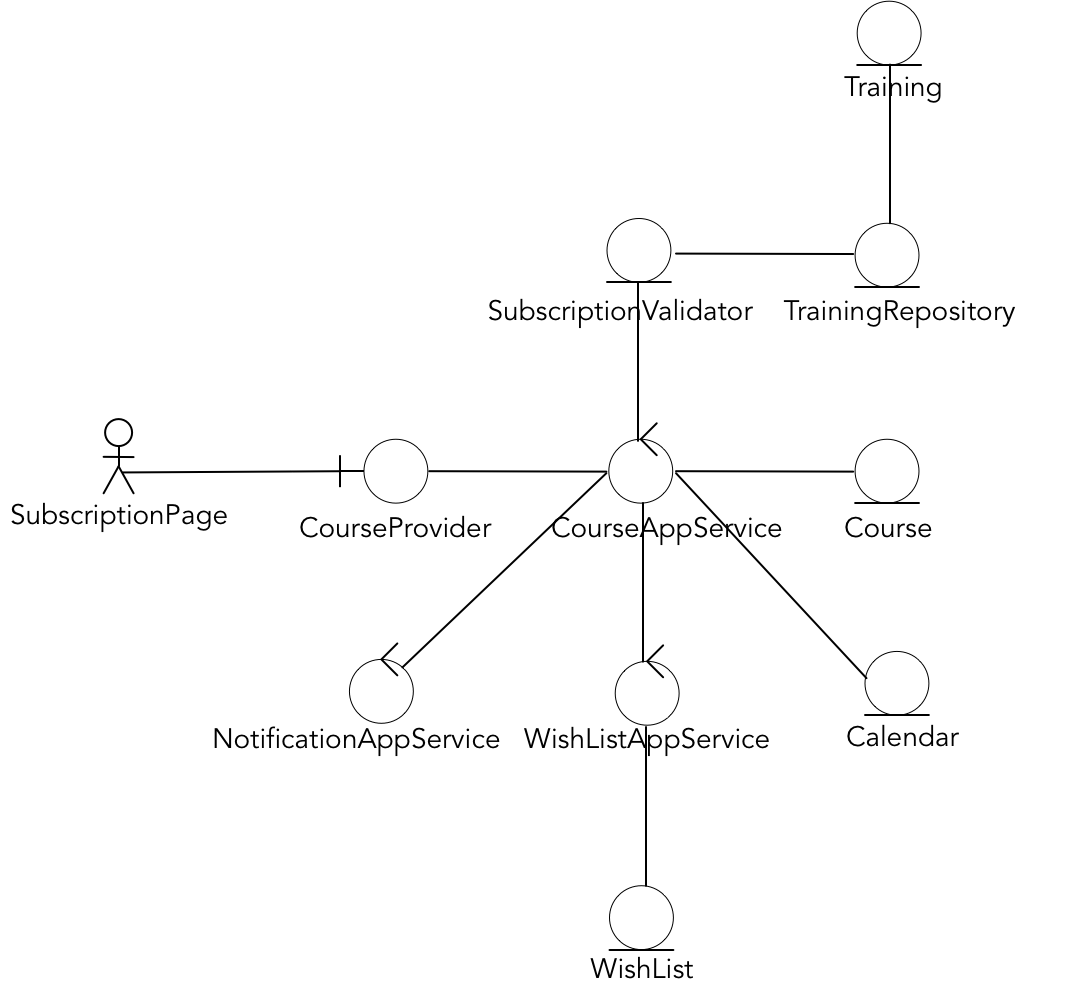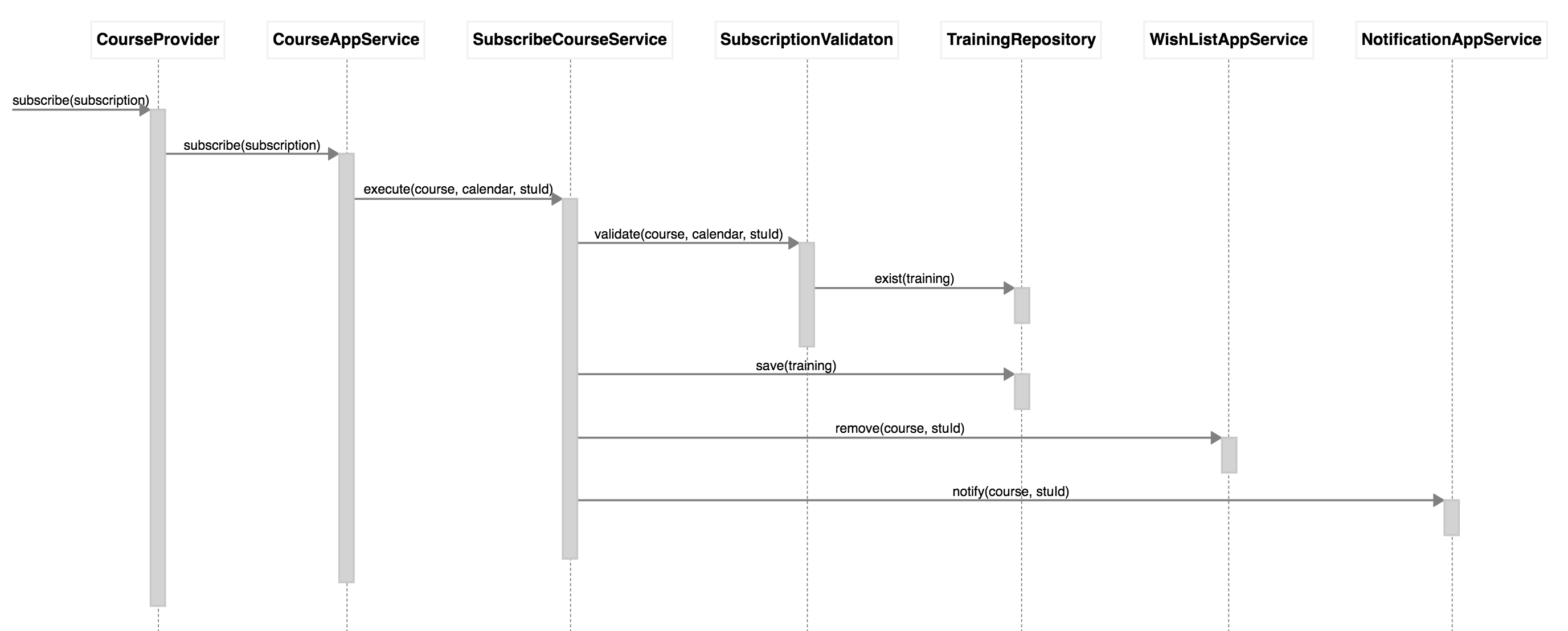 健壮性图只是粗略地表达了领域对象之间的关系。通过以上模型,其实我们也看到了该图在表达能力上的不足。例如,图中的 SubscriptionValidator 与 TrainingRepository 皆被表示为领域对象,却没有清晰地说明二者之间的差别,以及它们是如何协作的。这时就可以引入时序图来弥补这些信息的缺失,通过行为来展现用例中的事件流,确认对象之间的协作关系: