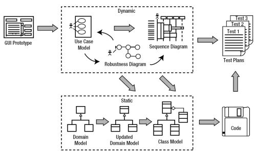 我们可以将 ICONIX 方法引入到服务模型驱动设计过程中。ICONIX 裁取了用例驱动设计与 UML 的核心子集,力求以最少步骤实现从需求、分析、设计到最后的代码实现。它通过 GUI 原型与用例分析获取需求,然后通过绘制健壮性图进行健壮性分析。健壮性图由边界对象(Boundary Objects)、控制对象(Control Objects)和实体对象(Entity Objects)构成,通过这种可视化图例与用例文本相对应来对需求进行健康检查。这个过程是领域分析和建模的过程,通过 ICONIX 健壮性分析可以帮助我们发现参与业务协作的对象。一旦识别了对象,就可以通过时序图表现对象之间的协作关系,从而确定职责的分配,定义对象的行为。该过程是一个动态过程。通过这个动态分析的过程又可以帮助我们建立静态的领域类模型,最终编写单元测试用例和实现代码。整个过程如下图所示:
