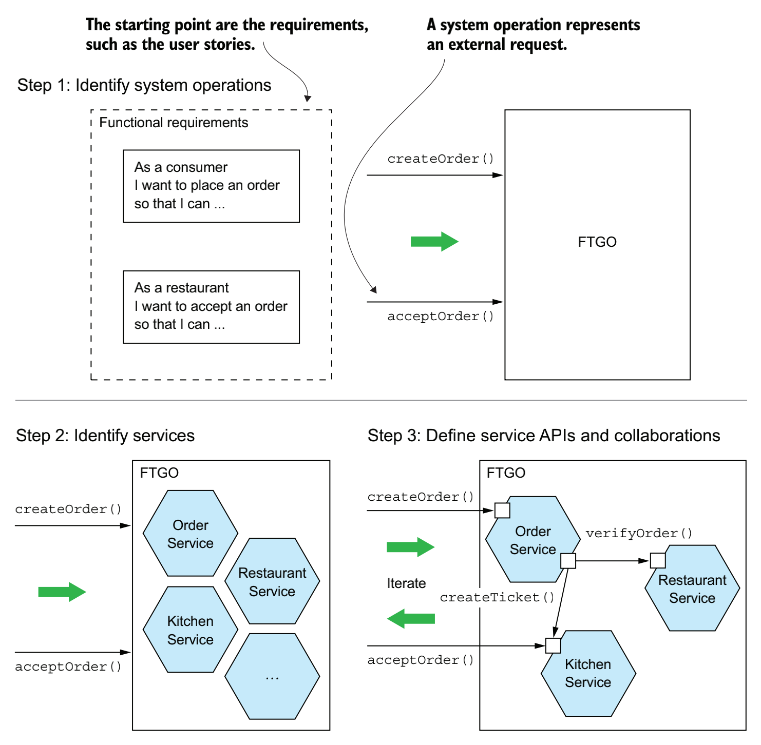 Chris Richardson 在《微服务架构设计模式》一书中给出的服务设计步骤与我介绍的服务模型驱动设计有相似之处。Chris Richardson 将微服务的设计分为三个步骤: