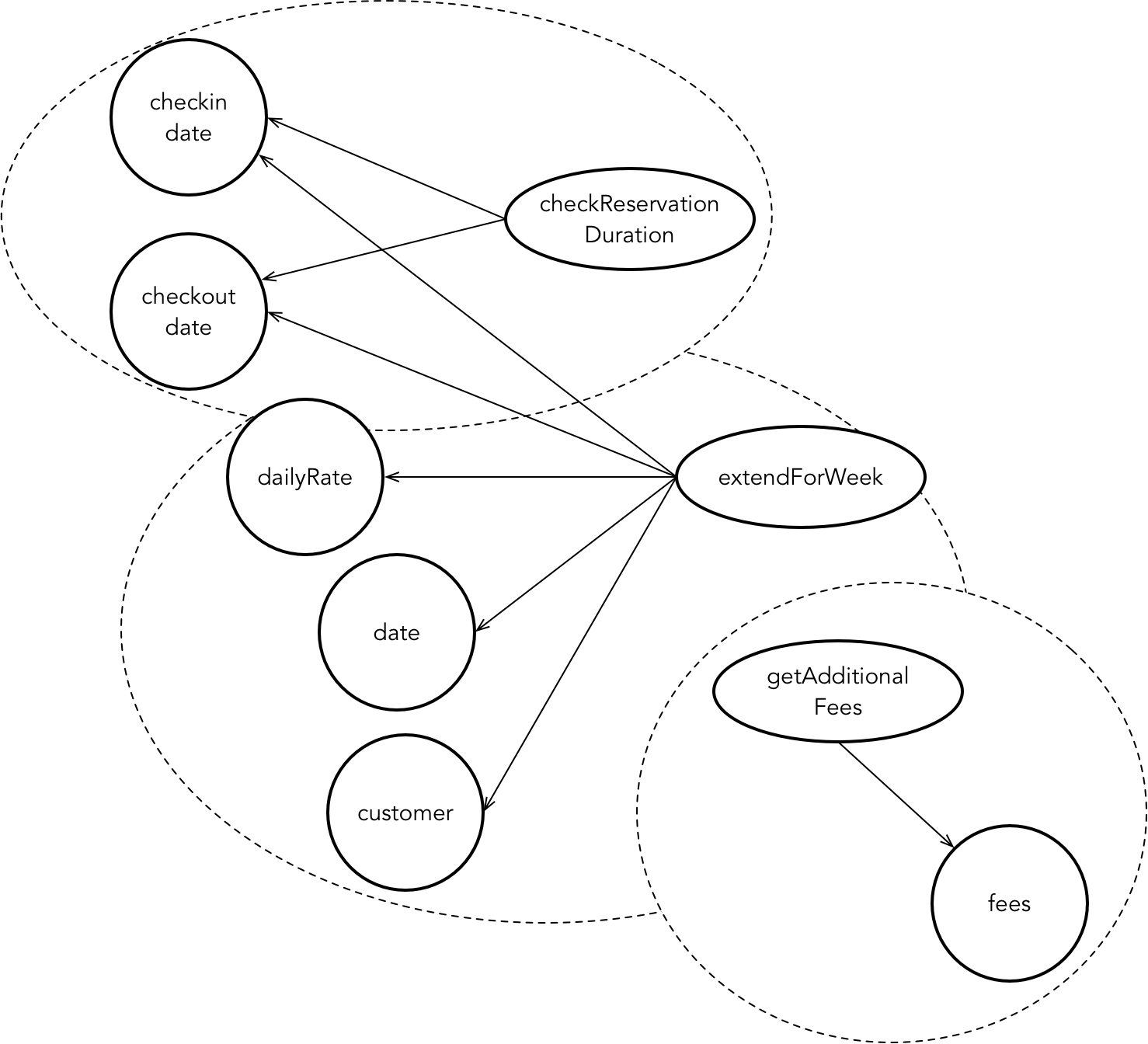 倘若审视方法与属性之间的关系,也可瞧出个中端倪。若一个方法仅仅操作了该实体的部分属性,则说明该方法与整个实体的关系要弱于与这部分属性之间的关系,如 checkReservationDuration() 方法与 Reservation 实体之间的关系,就要弱于它与 checkInDate 和 checkOutDate 之间的关系。这就需要依据关系强弱的差异对类的成员进行剥离。在《修改代码的艺术》一书中,Michael C. Feathers 将这种方式总结为职责识别的探索式方法——寻找内部关系。他还提出了通过绘制特征草图(Feature Sketch)的方法来描绘类内部的关系,从而判断类的职责分配是否合理。