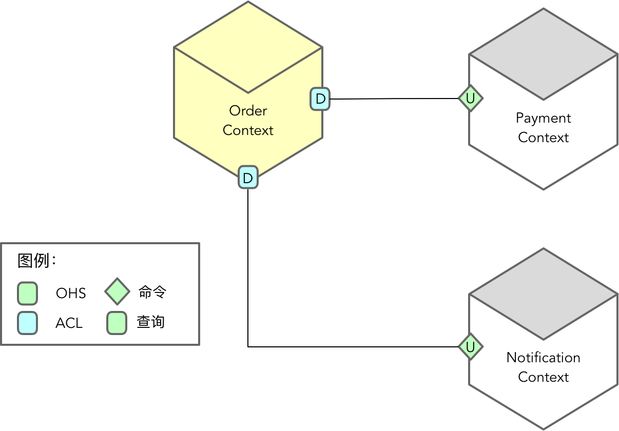 在买家下订单的业务场景中,考虑订单上下文与支付上下文之间的协作关系。如果采用 开放主机模式,则订单上下文将作为下游发起对支付服务的调用。支付成功后,订单状态被修改为“已支付”,按照流程就需要发送邮件通知买家订单已创建成功,同时通知卖家发货。这时,订单上下文会作为下游发起对通知服务的调用。显然,在这个业务场景中,订单上下文成为了整个协作过程的“枢纽站”: