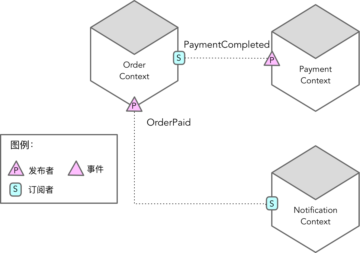 发布者—订阅者(Publisher-Subscriber)模式严格说来是一种架构模式,在领域驱动设计中,它通常用于限界上下文(或微服务)之间的通信与协作。为表区分,在领域模型内部使用事件进行状态通知的模式属于观察者模式,不属于发布者—订阅者的范畴。
