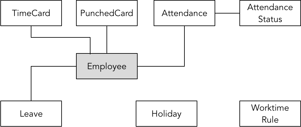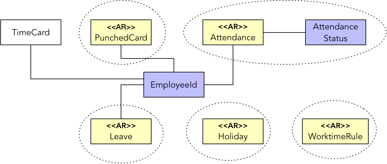 Holiday 与 WorktimeRule 的设计亦较特殊。本质上,它们应属于值对象,可通过值进行判等。例如,Holiday 对象通过 year、date 与 holidayType 的值即可确定 Holiday 的唯一性。然而,按照领域驱动设计的设计纪律,资源库只能管理聚合的生命周期,而聚合的根又只能是一个实体,因此需要将它们从值对象升级为实体。至于 PunchedCard、Attendance 等聚合根实体与 Employee 之间的关系只能通过 EmployeeId 进行关联,由此可以得到如下领域设计模型: