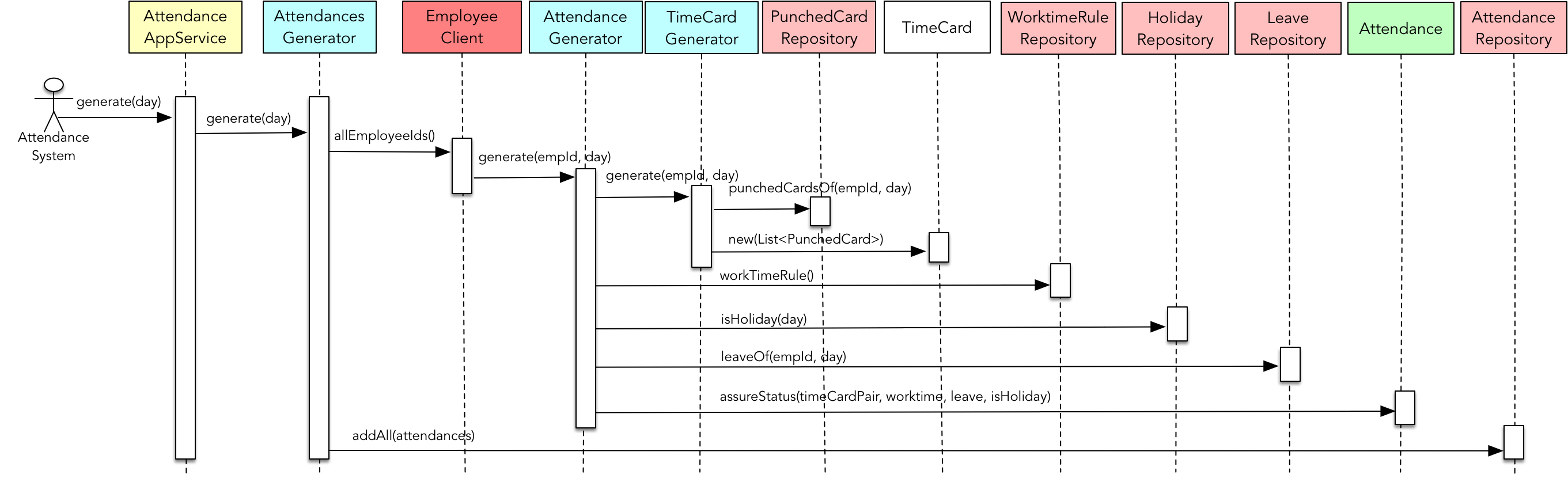 将领域场景分配给 AttendanceAppService,组合任务“生成出勤记录”分配给领域服务 AttendancesGenerator,然后将访问数据库的原子任务分配给相应聚合的资源库,然后将获得的信息作为方法参数传给聚合 Attendance,由其确定出勤状态。在为每位员工创建了具有正确出勤状态的 Attendance 对象后,由该聚合的资源库 AttendanceRepository 实现所有出勤记录的持久化。整个协作过程如下图所示: