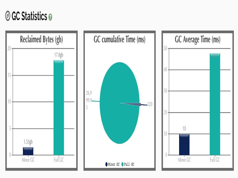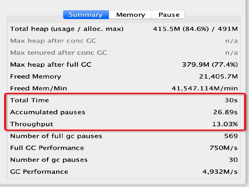 以上示例中的吞吐量为 13.03%。这意味着有 86.97% 的 CPU 时间用在了 GC 上面。很明显系统所面临的情况很糟糕——宝贵的 CPU 时间没有用于执行实际工作,而是在试图清理垃圾。原因也很简单,我们只给程序分配了 512MB 堆内存。