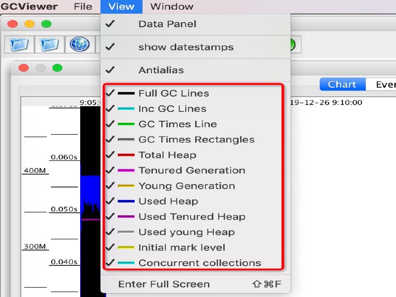 上图中,Chart 区域是对 GC 事件的图形化展示。包括各个内存池的大小和 GC 事件。其中有 2 个可视化指标:蓝色线条表示堆内存的使用情况,黑色的 Bar 则表示 GC 暂停时间的长短。每个颜色表示什么信息可以参考 View 菜单。