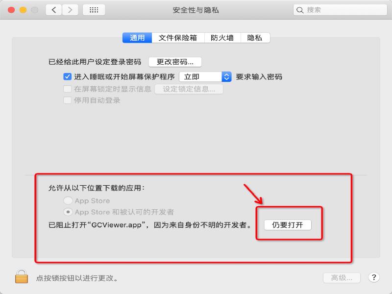 Mac 系统可以直接下载封装好的应用:gcviewer-1.36-dist-mac.zip。下载,解压,安装之后首次打开可能会报安全警告,这时候可能需要到安全设置里面去勾选允许,例如: