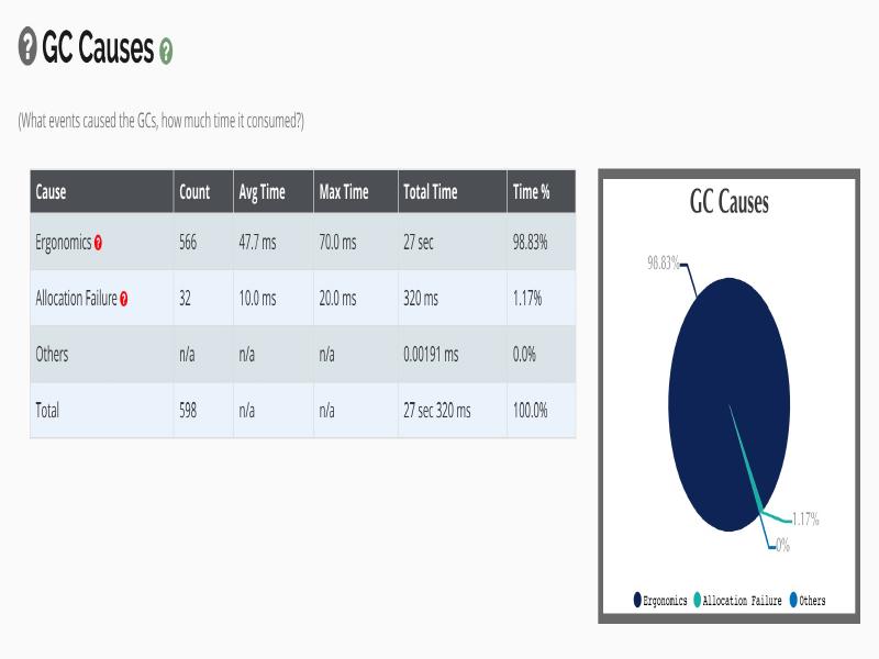 8. GC 原因汇总 可以看到 GC 发生的原因,其中 566 次是 GC 策略自己调整的(Ergonomics),32 次是因为分配失败导致的。