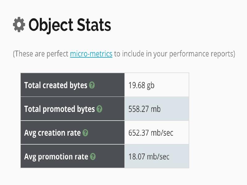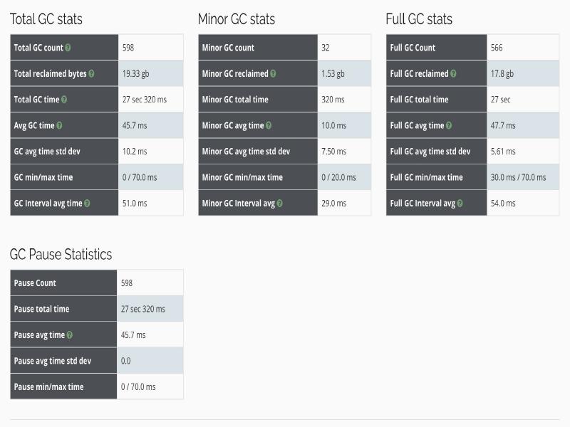 其中“Pause”展示了 GC 暂停的总时间,平均值,最小值和最大值,并且将 total 与 minor/major 暂停分开统计。如果要优化程序的延迟指标,这些统计可以很快判断出暂停时间是否过长。