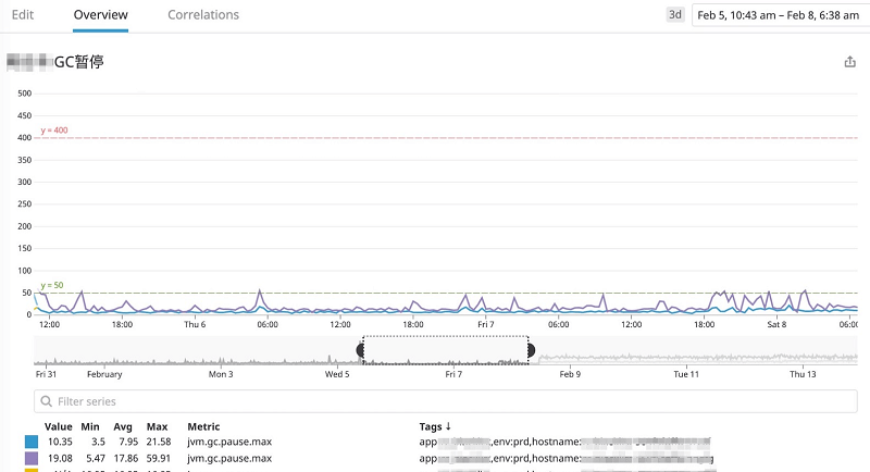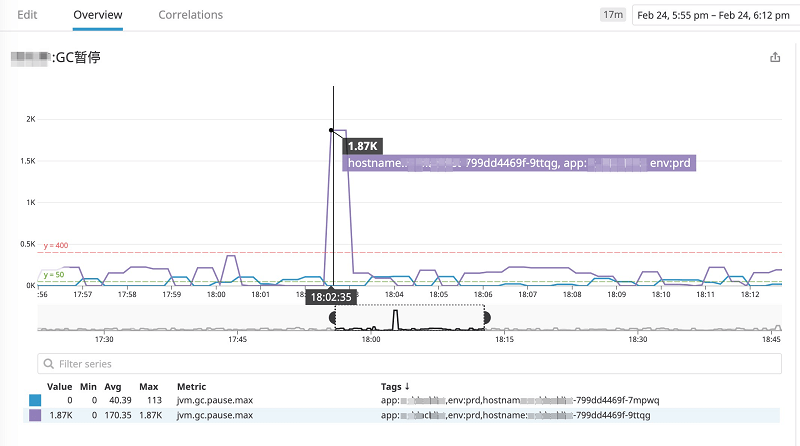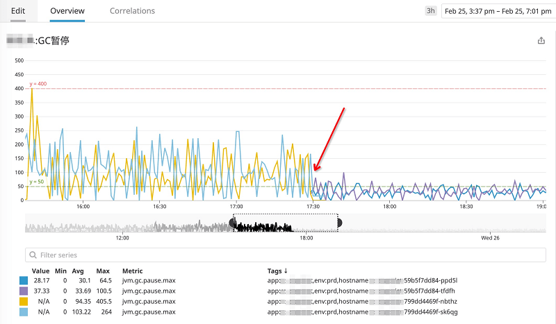 红色箭头所指示的点就是重启的时间点,可以发现,暂停时间基本上都处于 50ms 范围内。