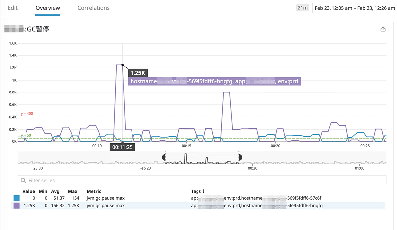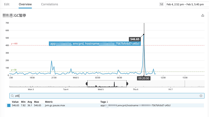 从图中可以看到,GC 暂停时间的峰值达到了 546ms,这里展示的时间点是 2020 年 02 月 04 日 09:20:00 左右。
