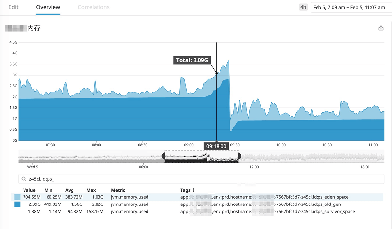 GC 内存使用情况 然后我们排查了这段时间的内存使用情况¶