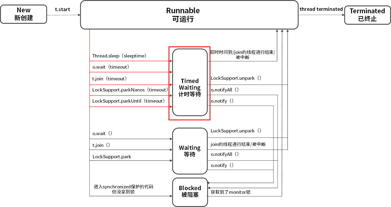当然对于 Timed Waiting 而言,如果它的超时时间到了且能直接获取到锁/join的线程运行结束/被中断/调用了LockSupport.unpark(),会直接恢复到 Runnable 状态,而无需经历 Blocked 状态。