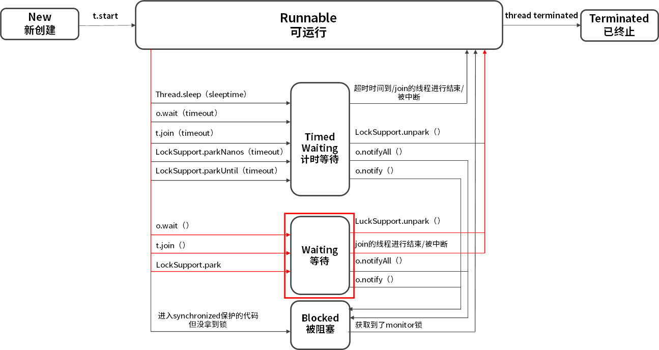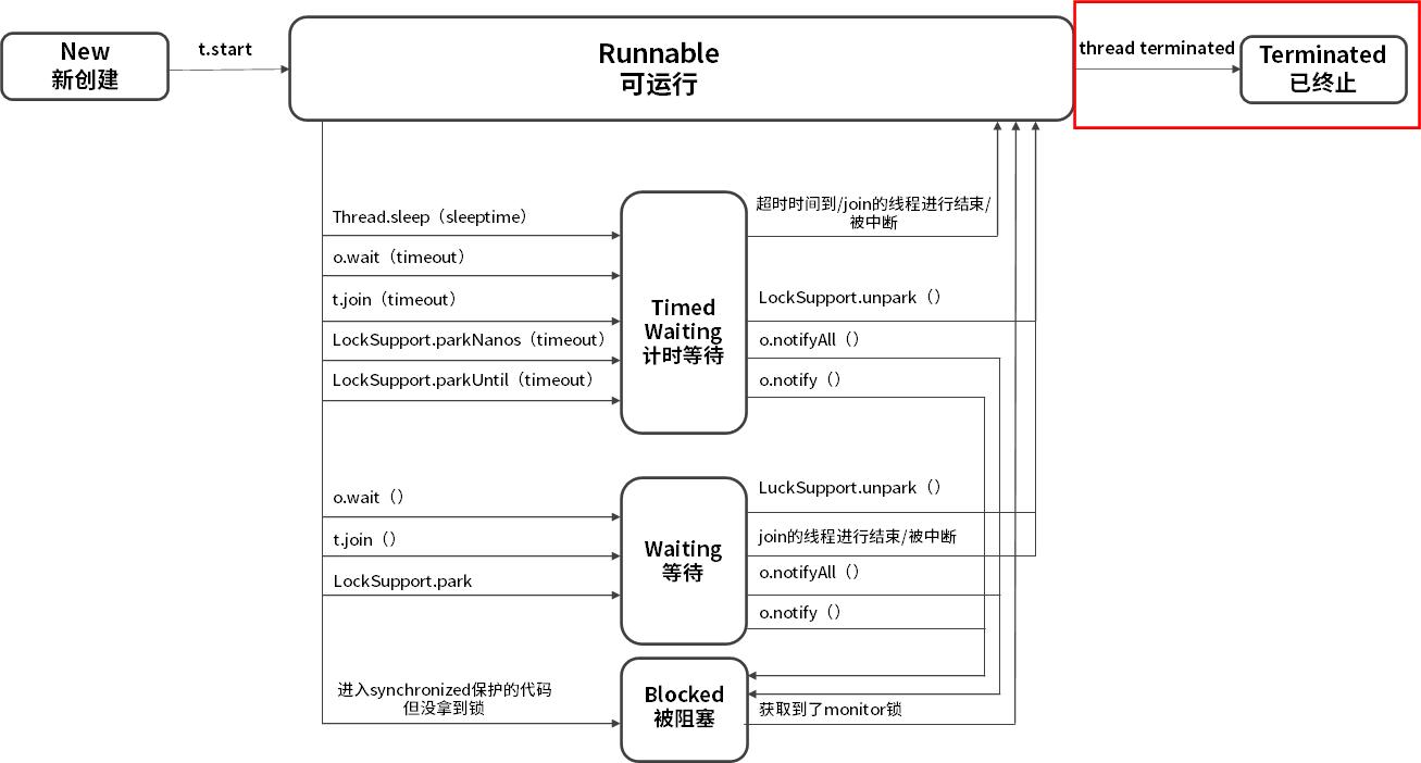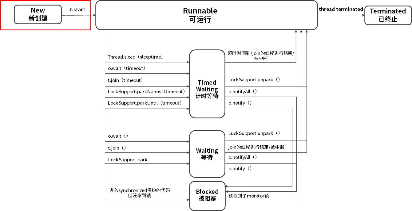 - 线程生命周期不可逆:一旦进入 Runnable 状态就不能回到 New 状态;一旦被终止就不可能再有任何状态的变化。所以一个线程只能有一次 New 和 Terminated 状态,只有处于中间状态才可以相互转换。