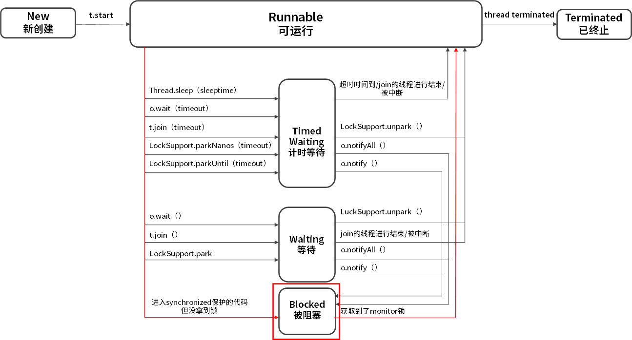 - 线程的状态是需要按照箭头方向来走的,比如线程从 New 状态是不可以直接进入 Blocked 状态的,它需要先经历 Runnable 状态。