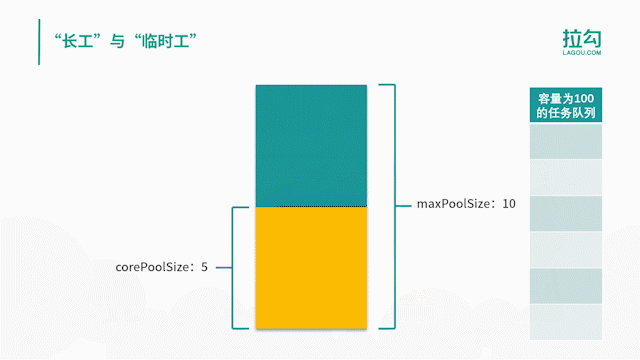 我们可以把 corePoolSize 与 maximumPoolSize 比喻成长工与临时工,通常古代一个大户人家会有几个固定的长工,负责日常的工作,而大户人家起初肯定也是从零开始雇佣长工的。假如长工数量被老爷设定为 5 人,也就对应了 corePoolSize,不管这 5 个长工是忙碌还是空闲,都会一直在大户人家待着,可到了农忙或春节,长工的人手显然就不够用了,这时就需要雇佣更多的临时工,这些临时工就相当于在 corePoolSize 的基础上继续创建新线程,但临时工也是有上限的,也就对应了 maximumPoolSize,随着农忙或春节结束,老爷考虑到人工成本便会解约掉这些临时工,家里工人数量便会从 maximumPoolSize 降到 corePoolSize,所以老爷家的工人数量会一致保持在 corePoolSize 和 maximumPoolSize 的区间。