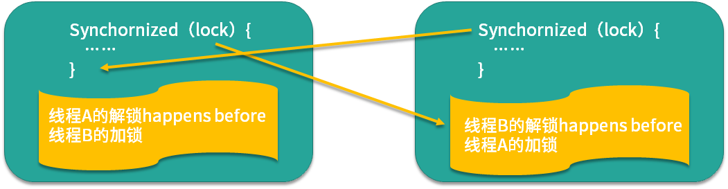 对于 synchronized 而言,线程 A 在进入 synchronized 块之前或在 synchronized 块内进行操作,对于后续的获得同一个 monitor 锁的线程 B 是可见的,也就是线程 B 是可以看到线程 A 之前的操作的,这也体现了 happens-before 针对 synchronized 的一个原则。