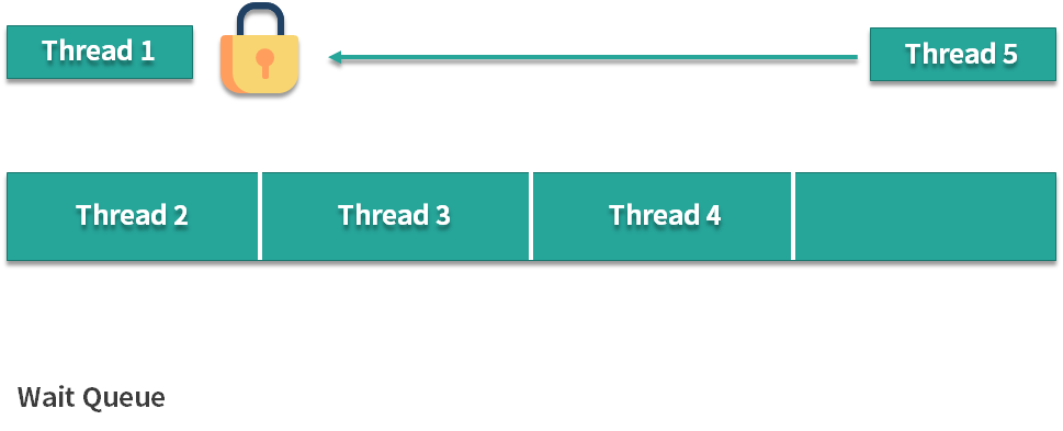 下面我们再来看看非公平的情况,假设线程 1 在解锁的时候,突然有线程 5 尝试获取这把锁,那么根据我们的非公平策略,线程 5 是可以拿到这把锁的,尽管它没有进入等待队列,而且线程 2、3、4 等待的时间都比线程 5 要长,但是从整体效率考虑,这把锁此时还是会交给线程 5 持有。