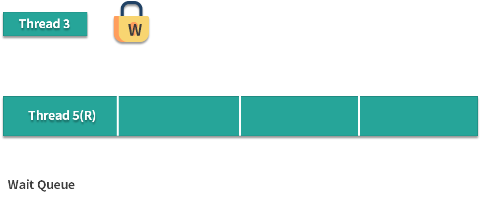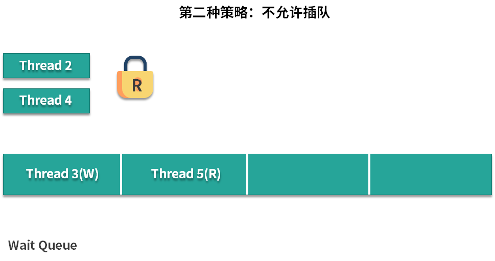 假设线程 2 和线程 4 正在同时读取,线程 3 想要写入,但是由于线程 2 和线程 4 已经持有读锁了,所以线程 3 就进入等待队列进行等待。此时,线程 5 突然跑过来想要插队获取读锁:
