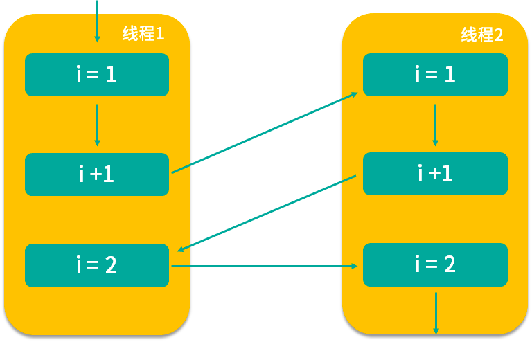 我们根据箭头指向依次看,假设线程 1 首先拿到 i=1 的结果,然后进行 i+1 操作,但此时 i+1 的结果并没有保存下来,线程 1 就被切换走了,于是 CPU 开始执行线程 2,它所做的事情和线程 1 是一样的 i++ 操作,但此时我们想一下,它拿到的 i 是多少?实际上和线程 1 拿到的 i 的结果一样都是 1,为什么呢?因为线程 1 虽然对 i 进行了 +1 操作,但结果没有保存,所以线程 2 看不到修改后的结果。